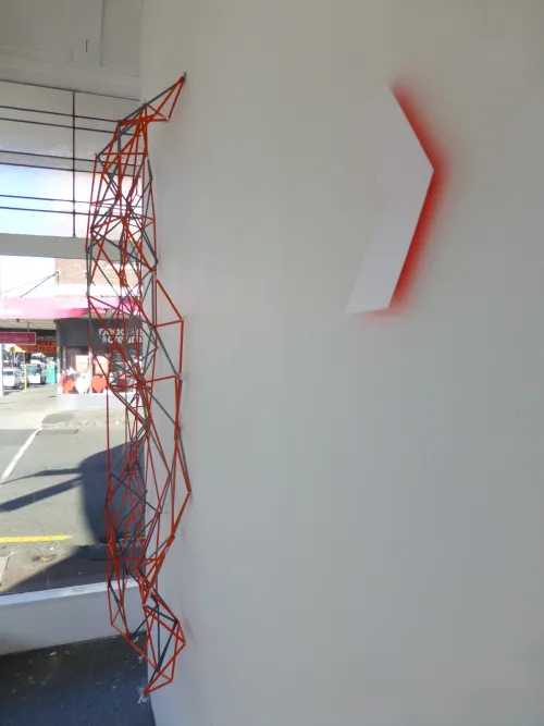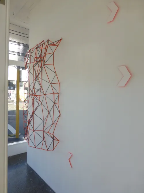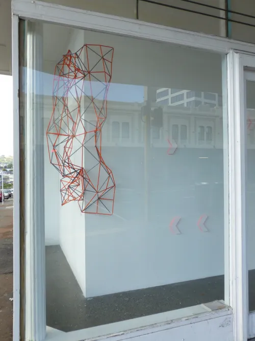 Construction and the structures that belong to it alter our perception. The latent space becomes active. Structures in our environment outline and ‘make visible’ the space within them, which we inhabit; the space, that always was, is somehow made more present, when framed by those structures. Thread relates in part to the activity (an architecture practice) that is housed in this location and explores folding unfolding, expansion and contraction. The idea of construction of space, as a kinetic activity, interests me. It is something I am hyper-aware of within my own urban environment, and something that I have been engaging with in my installation projects.